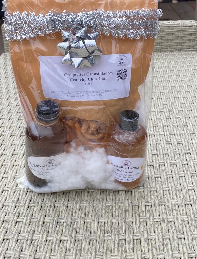 The gifts sets contain a pack of our delicious crunchy chin-chin, and natural extract (orange, vanilla or lemon).